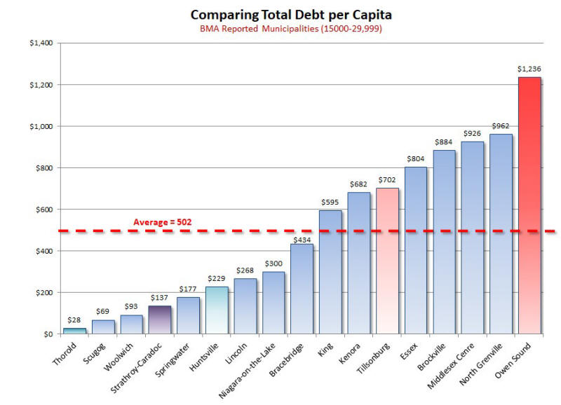 Note: Not every municipality with a population between 15,000 and 29,999 is shown here. That’s because not every municipality uses BMA services. However, there are enough municipalities in the chart above to give us a good feeling for how Owen Sound’s debt load compares with other Ontario municipalities in this population range.