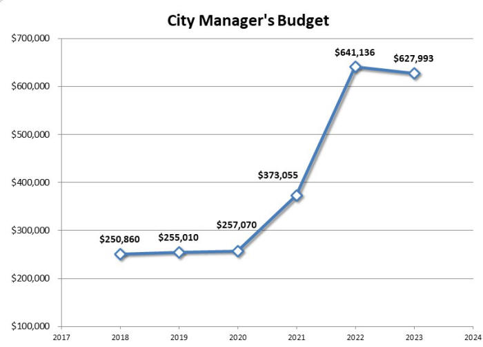 Figures 17 and 18 show two examples of excessive budget growth that exemplify the problem of spending growth at city hall. In regard to the city manager’s his budget grew by 150% in just two years.