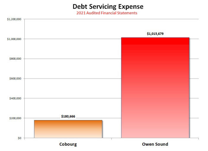 Amortization is an accounting method for spreading out the costs for the use of a long-term asset over the expected period the long-term asset will provide value. Figure 14 above shows the Amortization Expense for Owen Sound and municipality of Cobourg. This essentially means both municipalities have made similarly sized capital investments. Figure 15 shows that Owen Sound’s Debt Servicing Expense is significantly greater than Cobourg’s. Conversely, Cobourg spends only 17.8% of what Owen Sound spends annually to service its debt. This can only mean that Owen Sound has had to assume much more debt to fund those capital investments. The average debt servicing expense for the three primary comparators was only $235,240 in 2021 which is only 23.1% of what Owen Sound spends annually.