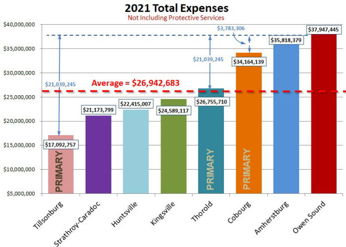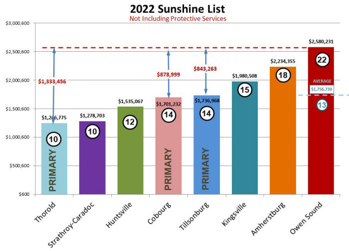If we include Protective Services the situation gets much worse. Owen Sound’s total with Protective Services is 79 compared to Cobourg’s total with Protective Services which is 53 – at total difference of 26 employees.