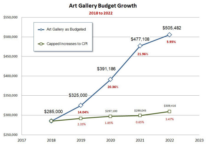 The Tom Thomson Art Gallery budget changes between 2018 and 2922 are shown below in figure 13. As you can see the Art Gallery’s budget grew by 77.3% in only four years, while inflation grew by only 3.47%.