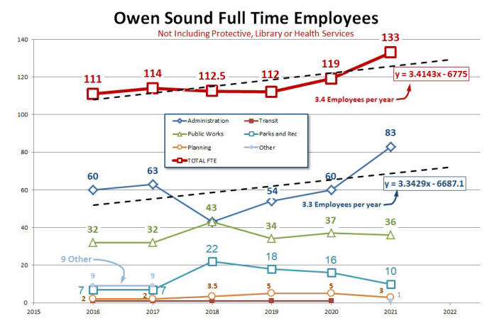 The full time employee trend line in Figure 27 (dotted line) shows us that the rate of increase of Full Time Employees between 2016 and 2021 was 3.4 employees per year. Note that Administration Department’s trend line shows us that the rate of increase in Administration was 3.3 employees per year which pretty much accounts for all of the annual workforce increases during this period.