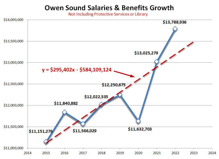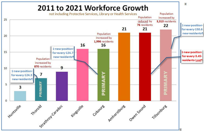 If we assume that the primary factor driving staff growth is population growth, we can calculate what size the Owen Sound workforce should be based on population growth. The average staff growth of the primary comparators was 0.75% of population growth. Based on the above staff-population growth ratio, the Owen Sound workforce should have been reduced by 76 x 0.0075 = 0.57 employees. If we round that off to 1.0 then the workforce should have been reduced by one employee instead of growing by 22 employees. This means that based on a direct correlation between staff growth and population growth the Owen Sound workforce is overstaffed by 23 employees.
