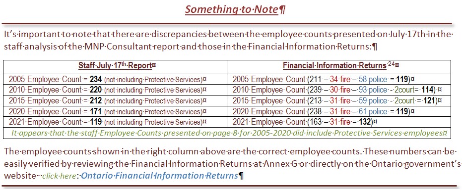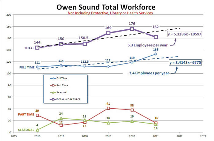 An interesting observation is that in the five years between 2016 and 2021 the total workforce, excluding Protective Services and Library, grew by 18 employees. This is a growth of 3.6 employees per year at a time when the population was relatively stagnant.